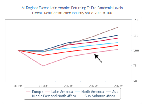 考虑到更广泛的宏观经济条件,预计发达市场和新兴市场之间在基础设施投资能力方面的差距将越来越大。财政状况较好且能够获得资本的市场将能够为该行业提供持续的刺激;财政状况较弱、获得资本渠道有限的市场将面临不断增加的债务负担和日益加剧的财政制约,从而限制公共投资能力。此外,尽管大多数市场可能会在2022年提高利率,但发达市场和新兴市场的政策空间和广度将有所不同,导致基础设施项目的政策支持程度不同。预计大多数发达市场的中央银行不会像市场预期的那样走强,而新兴市场在2022面临更大的紧缩货币政策压力。从地区来看,预计大多数地区的基建行业2022年基本恢复到新冠疫情前的状态,但是拉丁美洲的一些国家由于公共支出有限,政治风险升高,可能需要更长的时间恢复,国家间差异较大。受新冠疫情的影响,人们的生产生活方式发生了变化,移动办公、电子商务、供应链外包等形式越来越被人们所采用,将对全球非住宅建筑领域的投资产生重大影响。