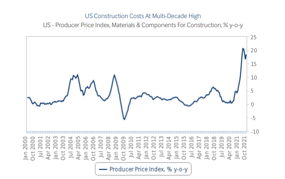 从需求方面看,住宅建筑和家庭装修活动,将成为推高建筑投入价格的驱动因素之一。根据美国的PPI指数,可以看出,2021年5月至10月的增长率为年均18.8%。随着经济再平衡,这些需求压力中的一些将在2022年得到缓解,家庭可以将其多余的储蓄从房屋装修转移到服务业。