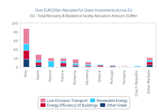目前绝大部分的欧盟成员国均已提交各自的恢复和复原计划供欧盟委员会批准,概述了其用于分配构成恢复和复原机制的赠款和贷款的支出计划。数据显示,为整个欧盟绿色基础设施投资分配的资金超过2260亿欧元(2530亿美元),其中870亿欧元(980亿美元)用于低排放交通基础设施,550亿欧元(620亿美元)用于可再生能源,500亿欧元(560亿美元)用于建筑节能投资。这直接反映了市场对恢复资金投资的最初预期,因为欧共体规定每个成员国总支出的37%应用于气候变化与变革有关的投资,未来这个数字将接近40%。