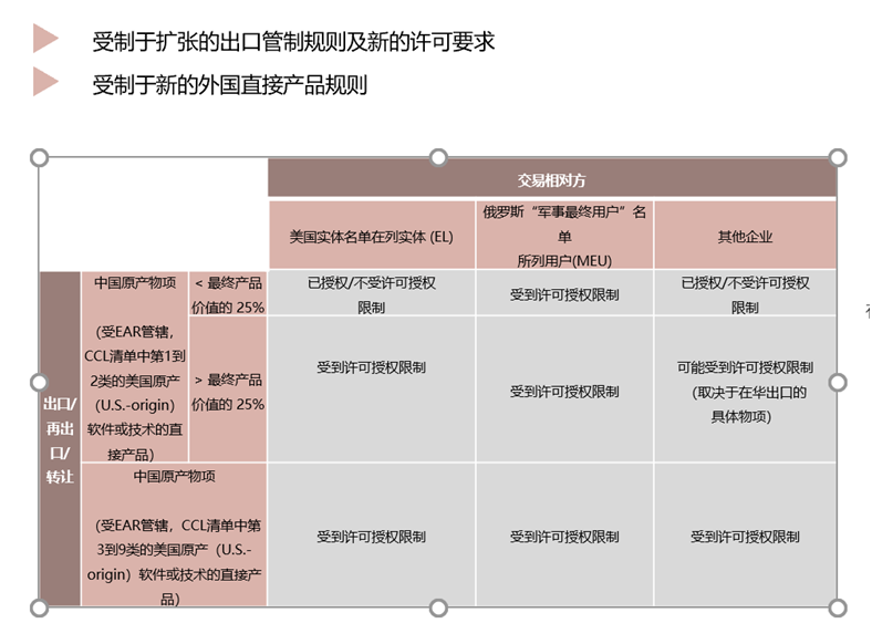 即使在相关交易不存在任何美国连接点的情况下,OFAC仍可能对参与违反OFAC制裁规定的重大交易(significant transaction)的非美国实体实施制裁。而重大交易基本上就是一个保底条款,美国政府认为这个交易会破坏到制裁就可能导致美国的制裁。结合以上美国连接点和50%规则,我们可以看出,与SDN主体的交易其实风险很大,即便使用人民币交易也不能完全排除风险。需要根据交易的情况综合设计。第二个比较重要的问题是直接外国产品规则(FDPR)。这个原则,美国人都很陌生,因为之前只用在华为身上,而现在美国将该规则直接用在被列入脚注 3 的名单中的俄罗斯实体身上,则根据该规则,即便低于最低美国成分(通常25%)也将需要许可证。“外国直接产品规则”FDP规则传统上是说,一个在外国生产的产品,若是使用美国软件或技术生产的直接产品,或利用美国技术或软件的工厂或设备生产的直接产品。而该美国软件或技术是因国家安全(National Security,NS)原因而受到出口管控的;同时该非美国制造的产品本身也被列入管控商品清单(Commercial Control List),且因国家安全原因受到美国出口管控。之前BIS刚刚对FDP规则进行修改,实际是明确了总共在四种情况下需要考虑适用 FDP 规则,即国家安全 FDP 规则、9x515 FDP 规则、600 系列FDP 规则和实体清单 FDP 规则。在这里,“600 系列”在出口管制法中指的是曾经受 ITAR 约束的军事物品(如1A607, 3B611, 6E619 )。9x515 ECCN 值得是“航天器”、宇航相关物品和一些曾经受 ITAR 约束美国 MML 第 XV 类的抗辐射微电子电路。(如9A515、9B515、9D515、9E515)。这次,则对更大主体的俄罗斯企业适用了该规则。这些措施下,中国对俄出口占到一半以上份额的电子产品或者机械产品都既有可能因为包含美国成分而导致违反美国的出口管制规则。而目前看来中国多数外贸企业的合规意识还停留在在未来的中俄贸易中收人民币就行了的层面上。