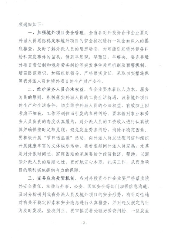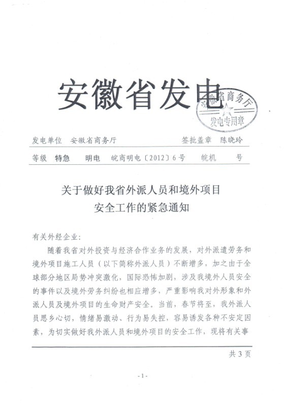 安徽省商务厅《关于做好我省外派人员和境外项目安全工作的紧急通知》