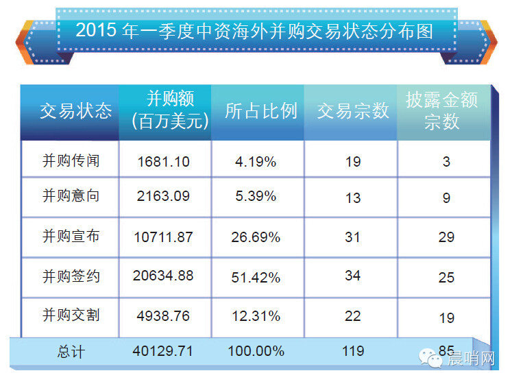 报告显示,2015 年一季度实现交割的海外并购交易共22宗,披露金额的19宗,涉资49.39亿美元。一季度新签约的海外并购共34宗,披露金额的有25宗,披露总金额达206.3亿美元。