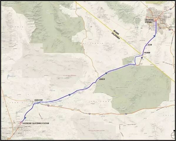 拉斯维加斯至洛杉矶高铁项目,又被西部快线称作“西南铁路网”项目,东起内华达州赌城拉斯维加斯,向西南延伸至加州的胜利谷(Victorville),而后向西连通加州帕姆代尔(Palmdale)。从帕姆代尔到洛杉矶已有现成铁路,加州政府也正在筹划改造升级该段线路。建成后,乘客乘坐高铁用仅用2个小时左右就可完成一次单程旅途,目前驾车在交通顺畅的条件下要4-5个小时。