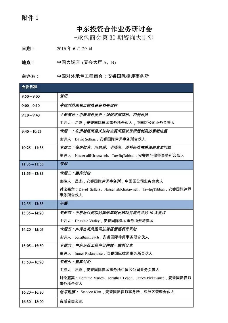 “中东投资合作业务研讨会——承包商会第30期咨询大讲堂”与您相约在北京的六月二十九日。本次研讨会主讲专家来自英国安睿律师事务所,国别涉及伊朗、沙特、伊拉克等主要市场,行业重点涵盖基础设施、电力、油气等领域。