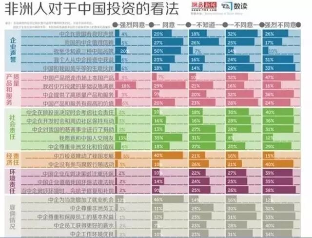 负面明显。2014年,南非职业道德研究所公布了一项针对在非中国企业的形象调查,参与调查者为来自15个非洲国家的常年与中国保持经济合作关系的经理人。报告分别就在非中企的声誉、产品和服务质量、社会和经济责任、对环保的重视以及雇佣状况进行了调查,结果显示,在非洲人眼中,当地的中国企业呈现全方位的明显负面形象:它们不仅声誉不好、产品服务质量差,还毫无社会责任感,工资不高,也不尊重非洲员工。