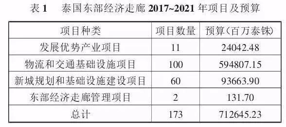东部经济走廊规划包括发展优势产业、物流和交通基础设施、新城规划和基础设施建设、东部经济走廊管理4个项目种类,项目数量达到173个,涉及预算7126.4523亿泰铢。其中,政府预计投入1474.3464亿泰铢,其余5652.1059亿泰铢预算将引入民间资本共同投资。2017年将启动48个项目,投入183.1417亿泰铢。